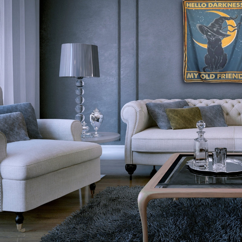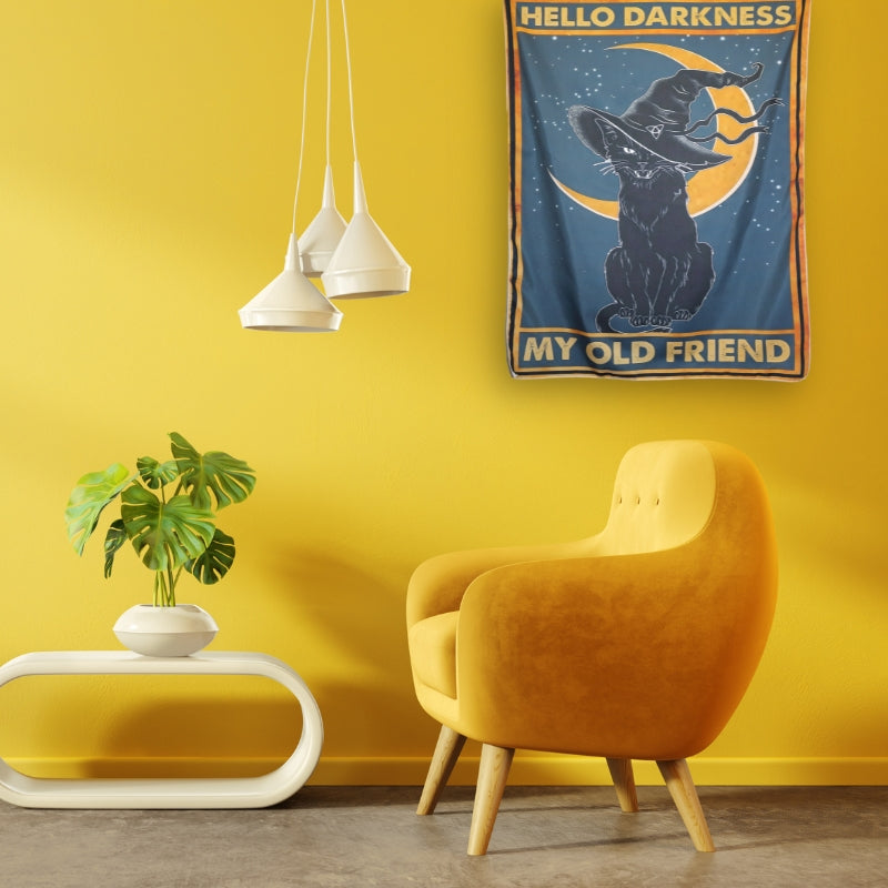 Hello Darkness Black Magic Cat Wearing Witches Hat Magical Wiccan Wall Hanging