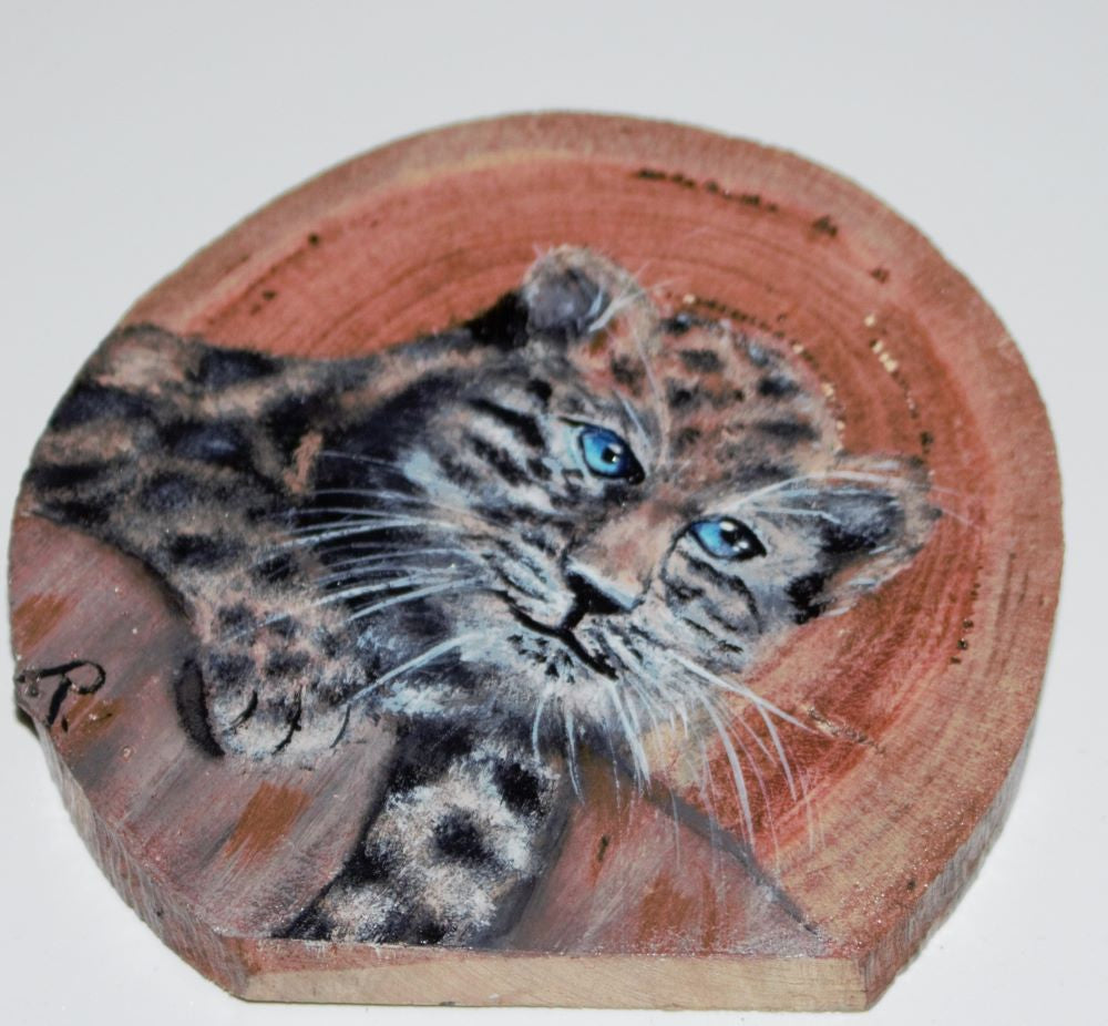 Hand Painted Wooden Ornament -Leopard Cub Wood Round -Home Décor