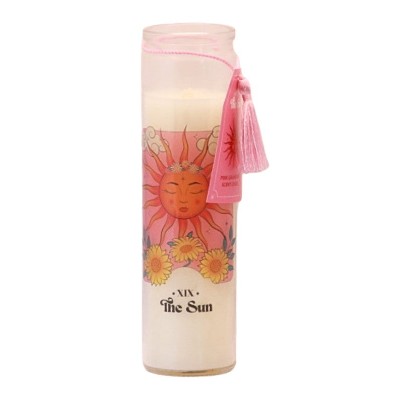 Decorative and practical, these pink grapefruit scented candles, modelled off the 7 day prayer candles and decorated with a vintage image of "The Sun" Tarot card are perfect for gifting or for decorating you altar or sacred space.