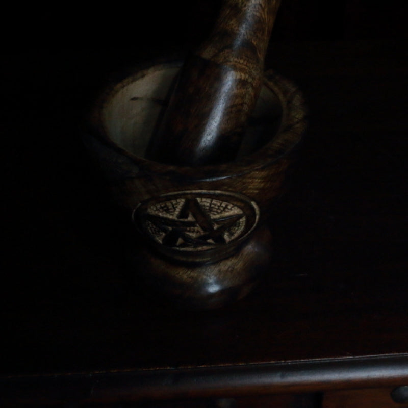 Practical and decorative, this Mortar and pestle carved with the pentacle symbol is the ideal way to round out your practice.
