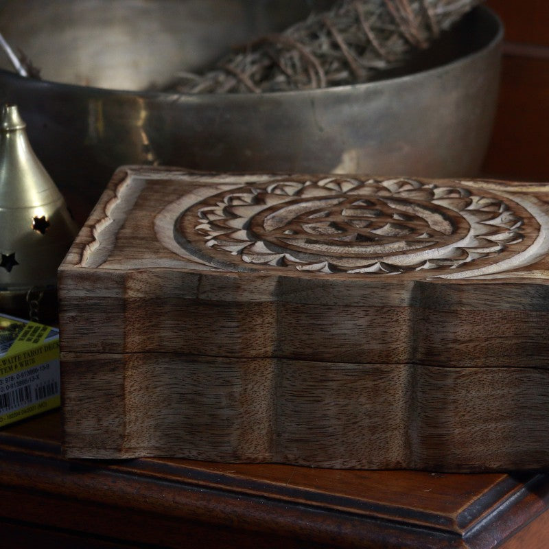 This beautiful carved wooden box is the perfect storage solution for your witch accessories and tarot cards.