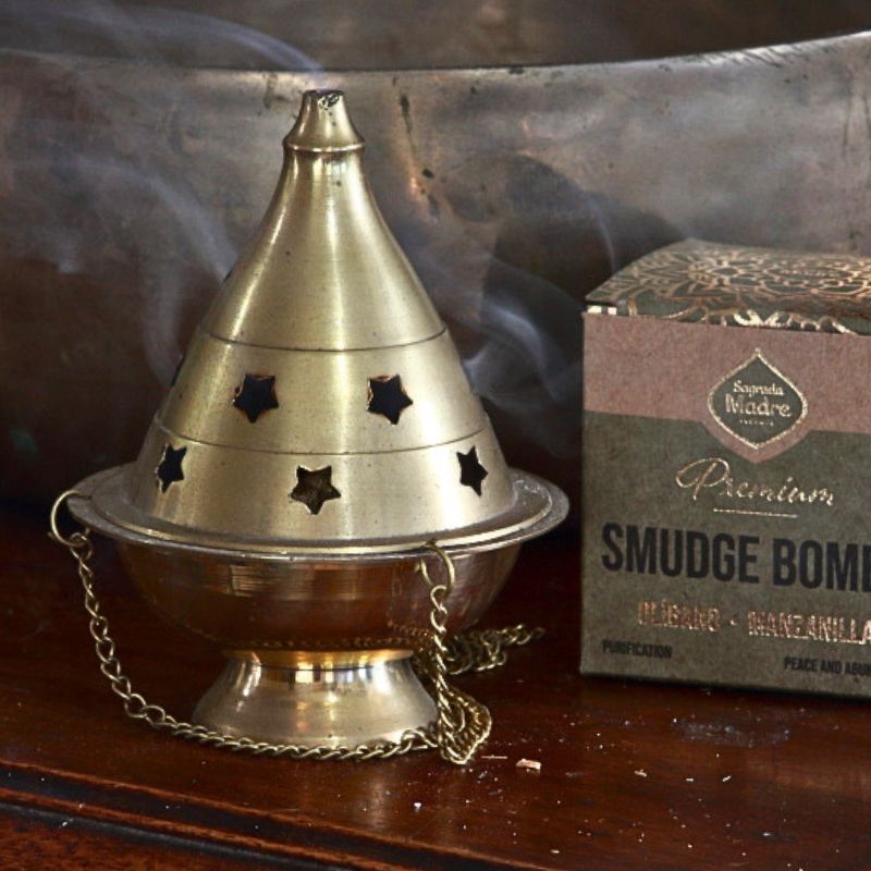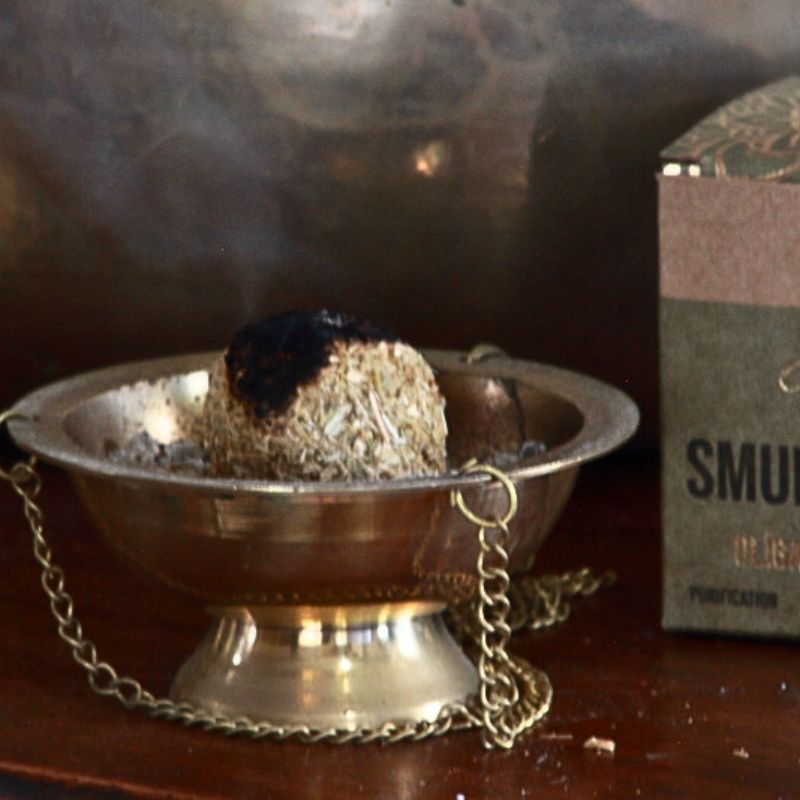 - Place the smudge bomb onto a fireproof plate/container such as a censer, cauldron or smudge bowl.